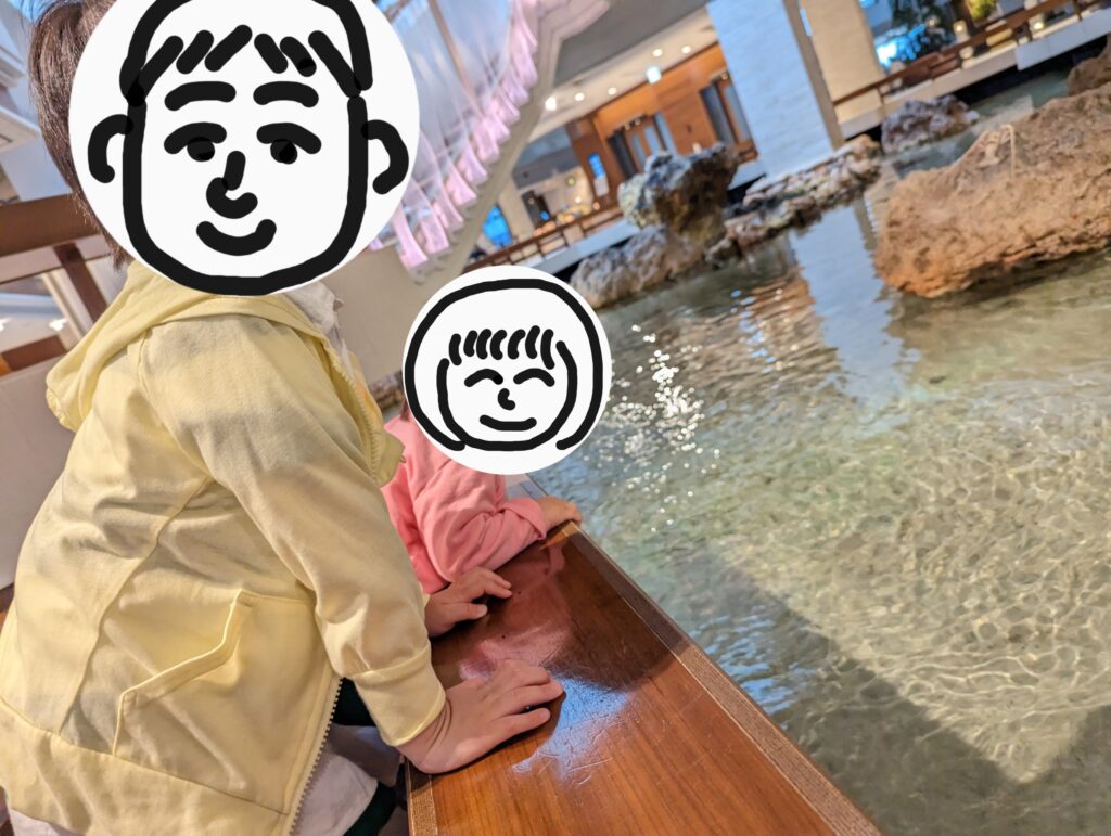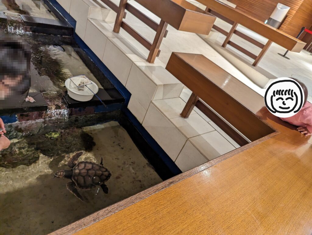 ちょっと目を離すと落っこちちゃいそうなぐらい水だらけですが、お魚がたくさんいて子供たちはずっと眺めていられます。また、ウミガメもいて、運が良ければえさやりも見ることができます。