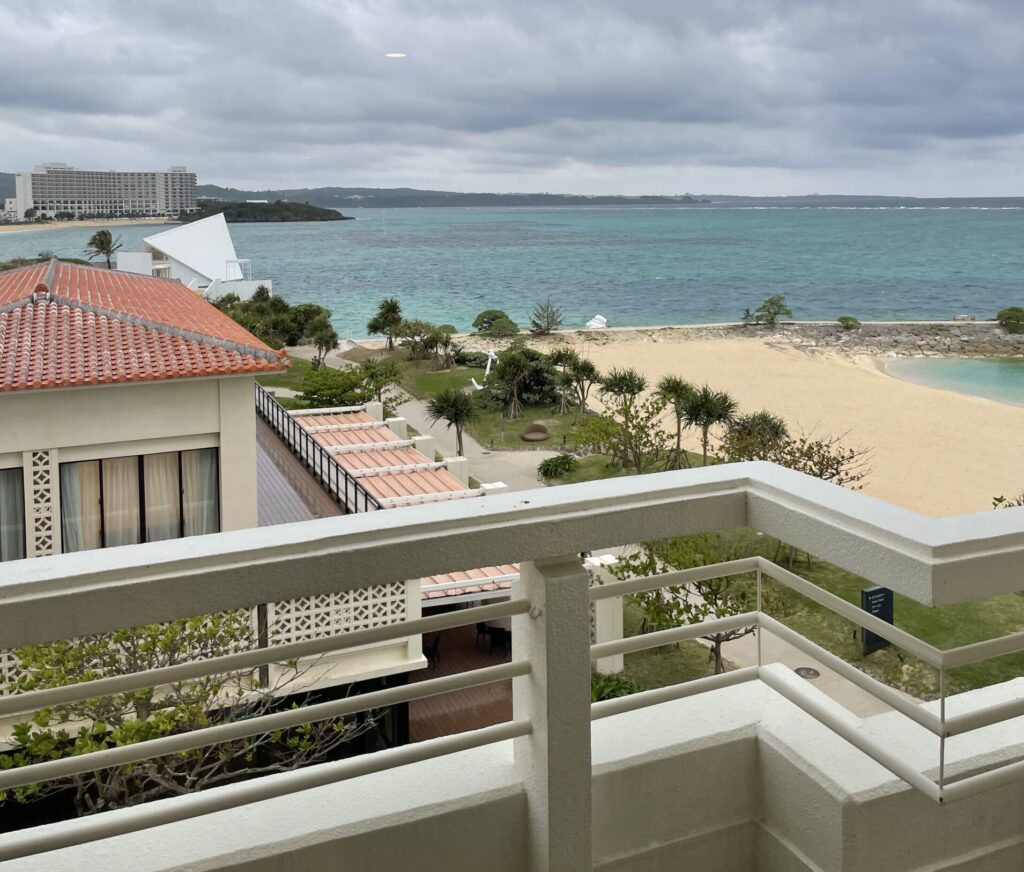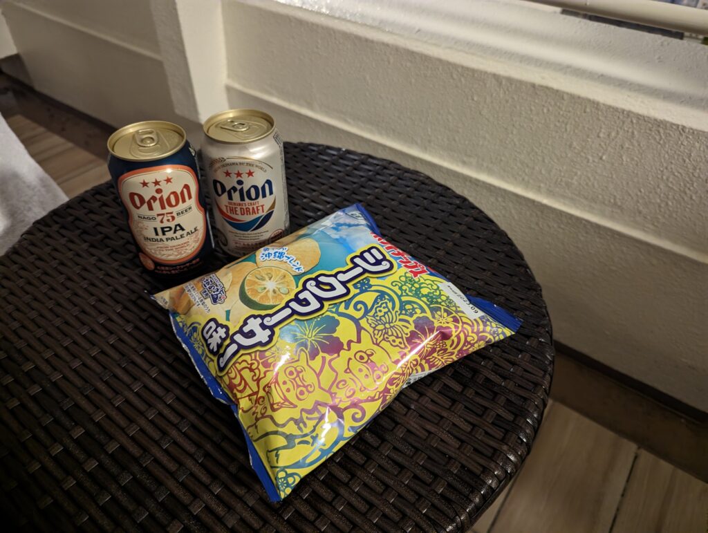 上位の部屋ではなかったので部屋の中は普通でしたがさすがのオーシャンビュー。テラスも広くはありませんが、机と椅子は用意されているので、沖縄っぽいお菓子やお酒を持ち込んで波音を聞きながら贅沢なひとときを過ごすことができました。