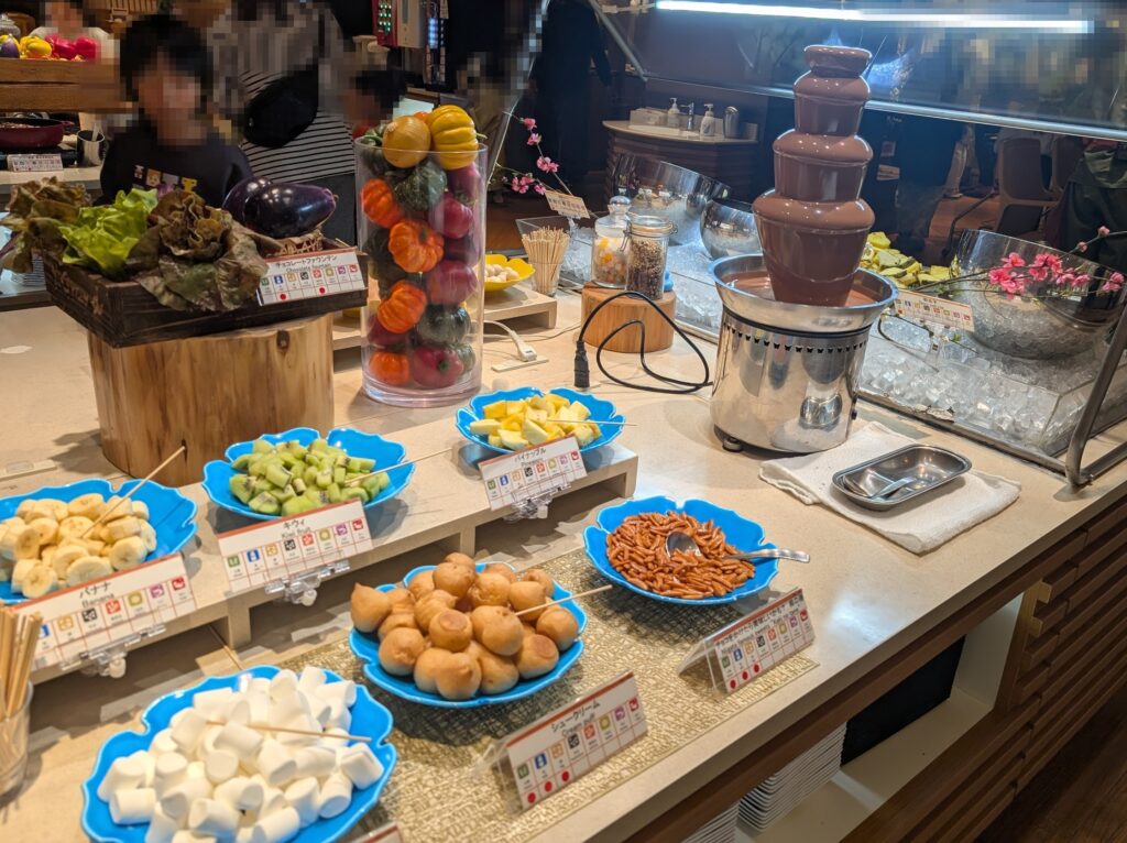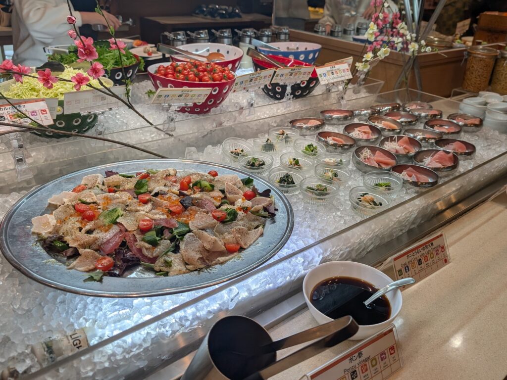 夕食は18:00〜のみで、17:59ぐらいに行きましたが並んでいる人がほとんどいなくて先頭グループで入ることができました。18:10頃にはビュッフェ台もかなりの人だかりになっていたのでこのちょっとした時間が重要になってきそうです。