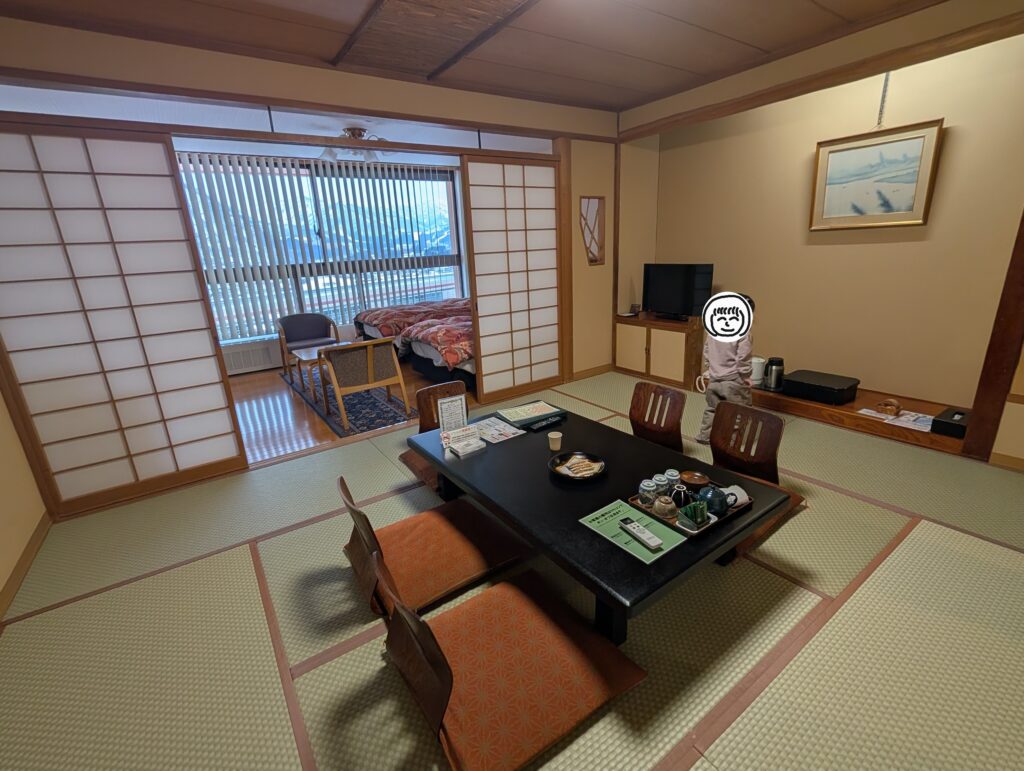 お部屋もレトロな雰囲気があります。和洋室に大人3人子供2人で宿泊したので、夕食中に畳の上に布団を敷いてくれていました。坊やはテレビが小さいと不満を言っていました笑