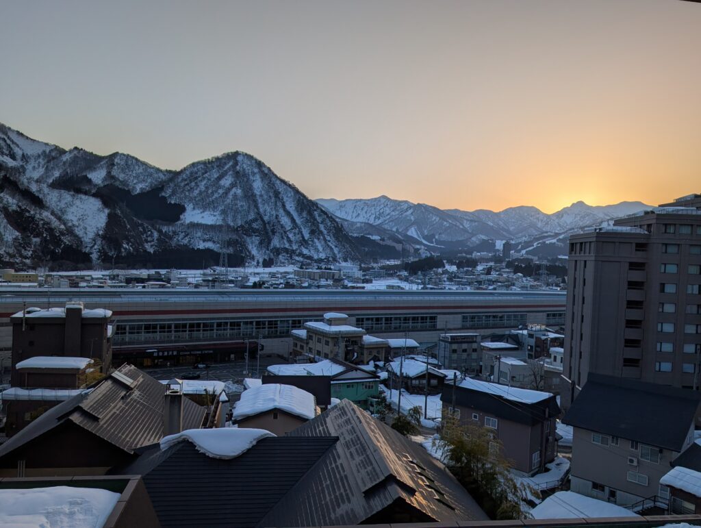 部屋の窓から見える越後湯沢駅&雪山越しの朝焼けがとても素敵でした。