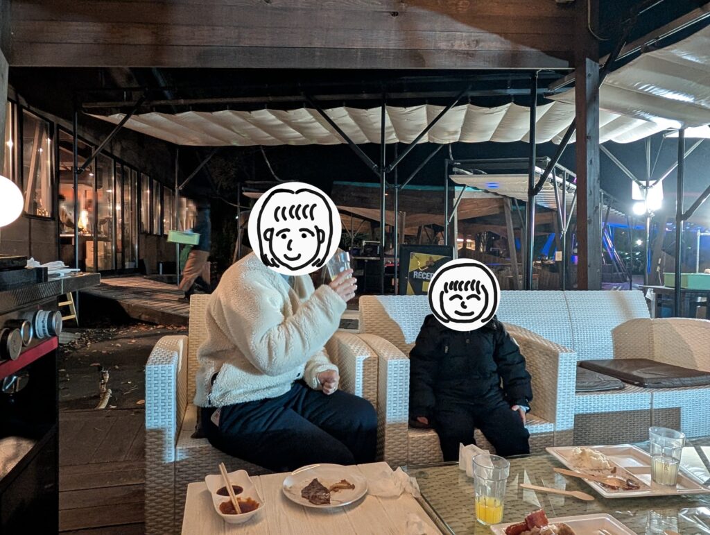 夕食付きにすると基本的に「部屋食」または「バーベキュー」を選択できますが、バーベキューの場合は食べ放題になります。お肉以外も割と充実しているので満足感は高いですが、当たり前ですが屋外なので11月の那須の夜はけっこう寒かったです笑