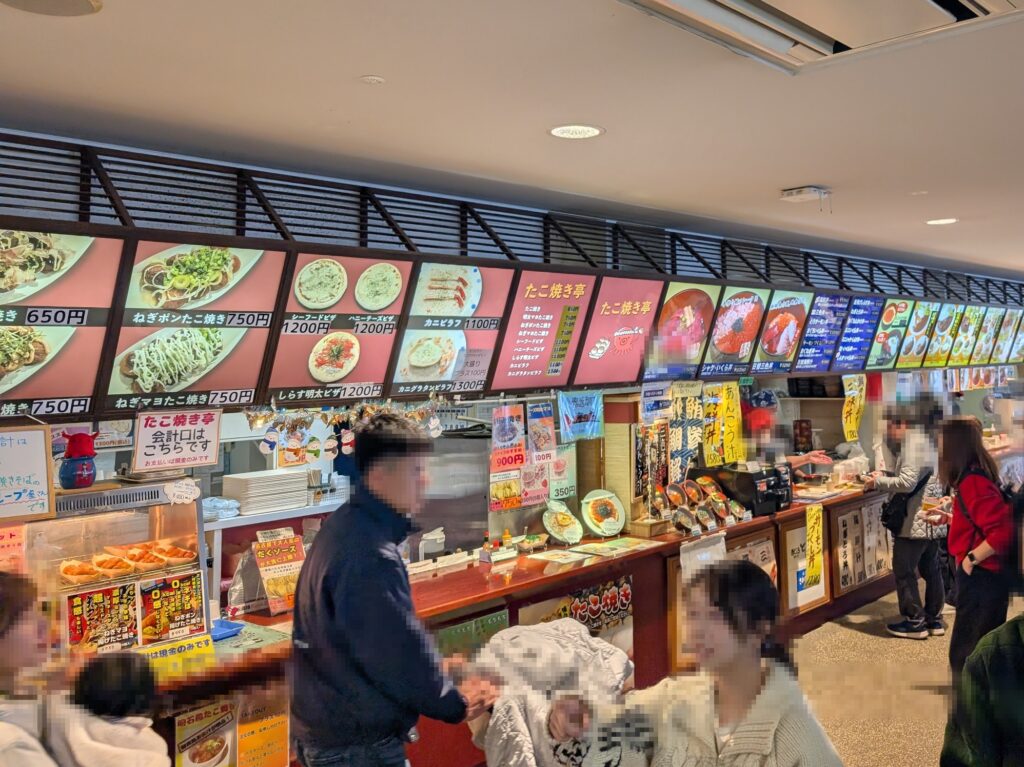 施設内に食事をできるところは2か所あります。水族館内3Fの『リラックスカフェ マーメイド』と入口の外にあるフードコートのようなエリアです。マーメイドは軽食が中心で座席数も多くないのでがっつり食事をしたい方はフードコートの利用がいいかなと思います。