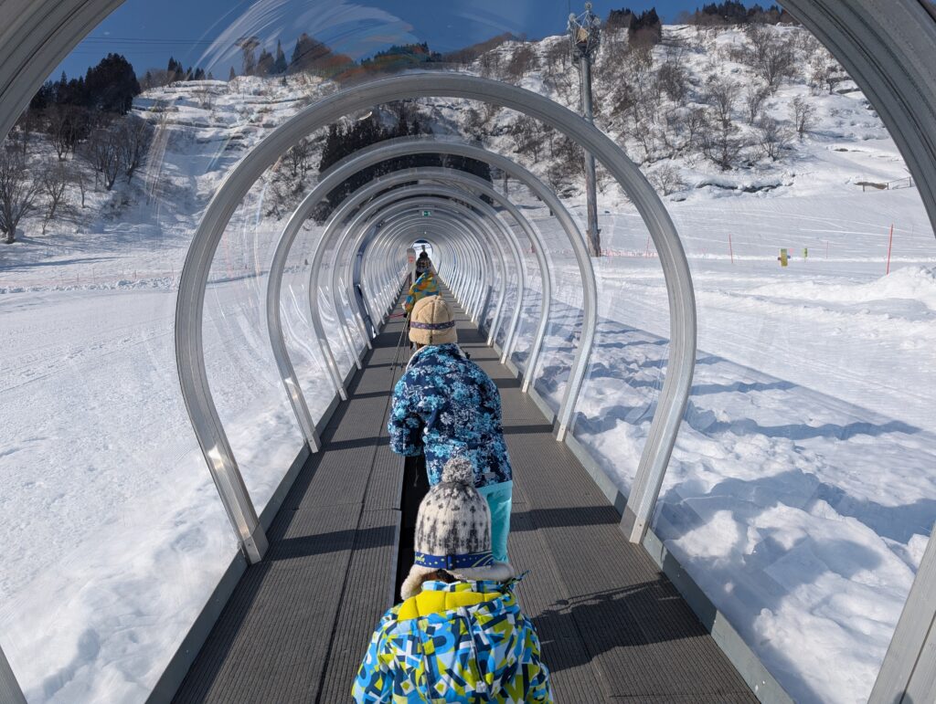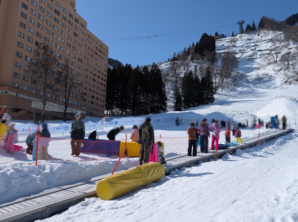 ゆきあそびパーク内にデビューコースが用意されていてリフトに乗るのが難しい子供でもスノーエスカレーターで登ることができます。初心者や子供にとってリフトは大きな壁の1つなので、スノーエスカレーターのおかげで純粋に滑ることだけに集中できるのはけっこう助かります。