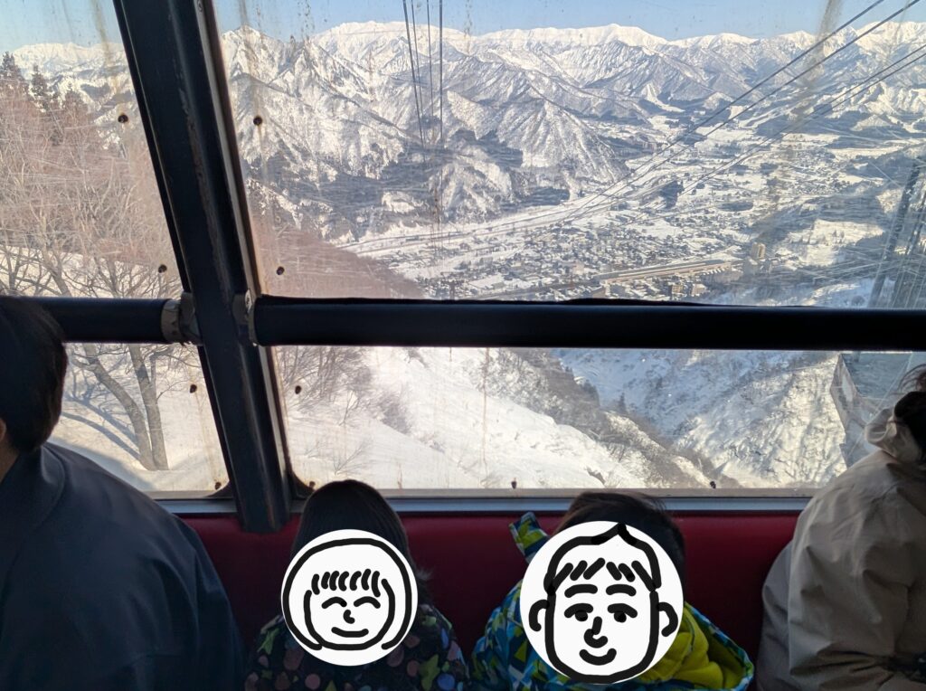 ロープウェイは観光利用も歓迎されていてスキー板やスノーボードを持たずに乗っておられる方もけっこういました。ロープウェイは20分に1回の運行で、けっこうなサイズがあるので毎回並んでいる人は全員乗り切っているように思います。早めに並んでロープウェイの後方、街を見下ろす方向に陣取るのがおすすめです。