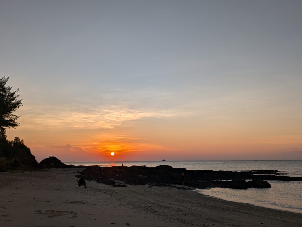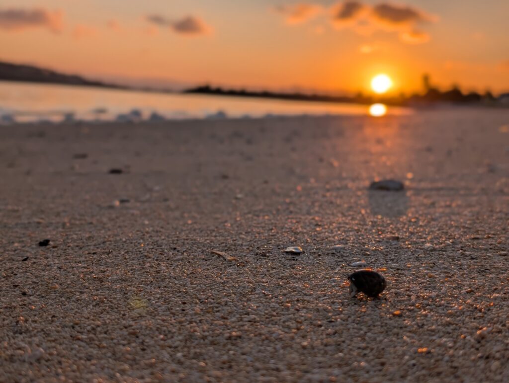 国頭郡今帰仁村。沖縄本島の西岸なので海から上がってくる日の出ではありませんが、ビーチから古宇利島、やんばるエリア越しに朝日を見ることができます。10月という季節柄もありますが非常に空いているのでのんびりすることができました。